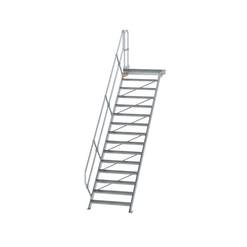 Ortsfeste Treppe mit Plattform aus Aluminium und Neigung 45° Stufen- und Plattformbreite: 1.000 mm Plattformlänge: 460 mm Letzte Stufe (Tiefe: 225 mm) auf gleicher Höhe wie Plattform montiert (Gesamttrittfläche: 685 mm) Stufen- und Plattformausführung standardmäßig in Aluminium geriffelt (R 9) · optional auch mit anderen Belägen erhältlich Handlauf und Geländer einseitig Ø 40 mm mit verschraubten Verbindungselementen (Höhe: 1.100 mm) serienmäßig Stirnseitiges Geländer gegen Mehrpreis erhältlich Zweiter Handlauf optional (bei Wandabstand über 120 mm nach DIN EN ISO 14122-3 erforderlich) Untere Holmenden mit robusten Fußwinkeln zur Bodenbefestigung Einfache Montage durch Lieferung in vormontierten Baugruppen inklusive Montageanleitung Bei Treppen mit Stufenbreite 800 oder 1.000 mm ist ab 3.300 mm senkrechter Höhe eine mittige Abstützung erforderlich (gegen Mehrpreis oder bauseits) Sofern bauseits keine Auflageflächen oder Befestigungen vorhanden sind · muss die Befestigung über eine Dreieckskonsole erfolgen Maximale Belastung: 1,5 kN/m2 · Stufenbelastung 150 kg · Gesamtbelastung 300 kg Hinweis: Im Standard sind Verbindungsteile aus verzinktem Stahl enthalten · welche für den Innenbereich geeignet sind. Gegen Mehrpreis können diese auch in Edelstahl ausgeführt werden · was für den Außenbereich empfohlen wird