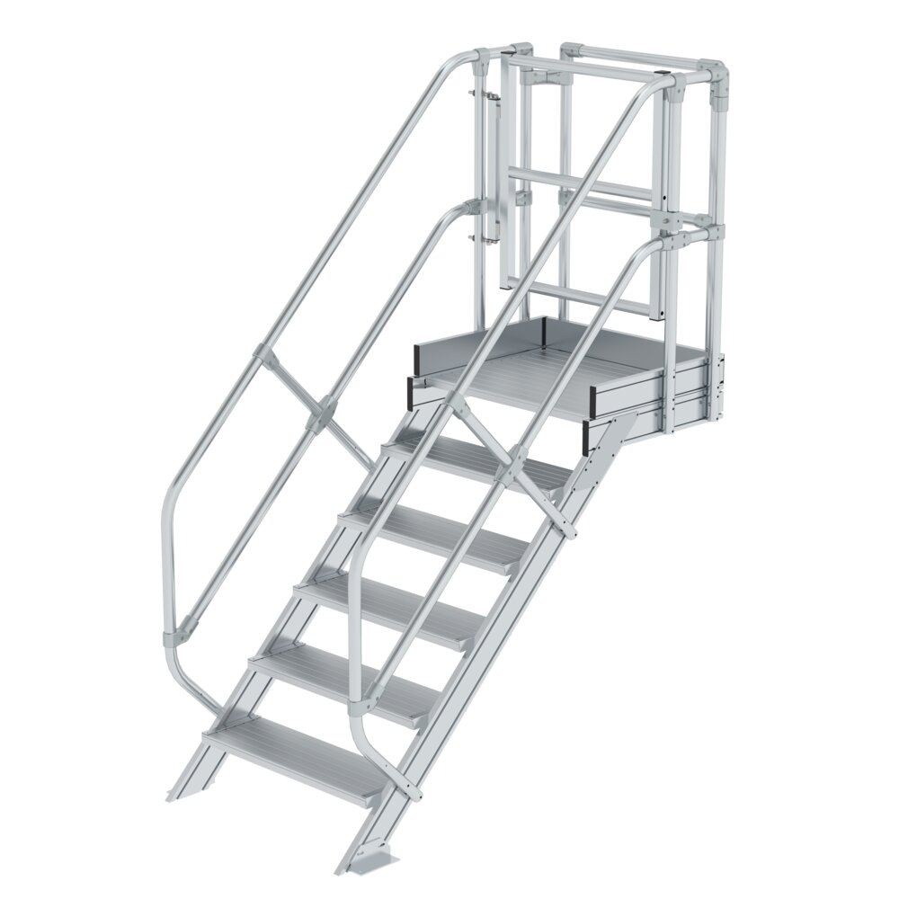 Ein Treppen-Modul besteht aus einer Treppe mit beidseitigem Handlauf · einer Plattform · einem stirnseitigen Geländer sowie einer Sicherungstüre Stufen- und Plattformausführung standardmäßig in Aluminium geriffelt (R 9) · optional auch in Stahl-Gitterrost (R 12) · Aluminium-Gitterrost (R 13) · Stahl-Lochblech (R 13) oder Aluminium-Lochblech (R 13) lieferbar Neigung: 45° Stufenbreite: 800 mm Stufentiefe: 225 mm Beidseitige starre Handläufe und Geländer mit Fuß- und Knieleisten (Höhe: 1.100 mm) Stationäre Befestigung mittels Fußwinkel Maximale Belastung: 1,5 kN/m2 · Stufenbelastung 150 kg · Gesamtbelastung 300 kg Hinweis: Bitte bei Bestellung die exakte · werkseitig benötigte Höhe (Plattformoberkante) angeben. Die Treppen-Module werden passgenau gemäß Anforderung geliefert. Zwischenmaße werden zum Preis der nächst höheren Stufenanzahl geliefert · andere Treppenneigungen auf Anfrage