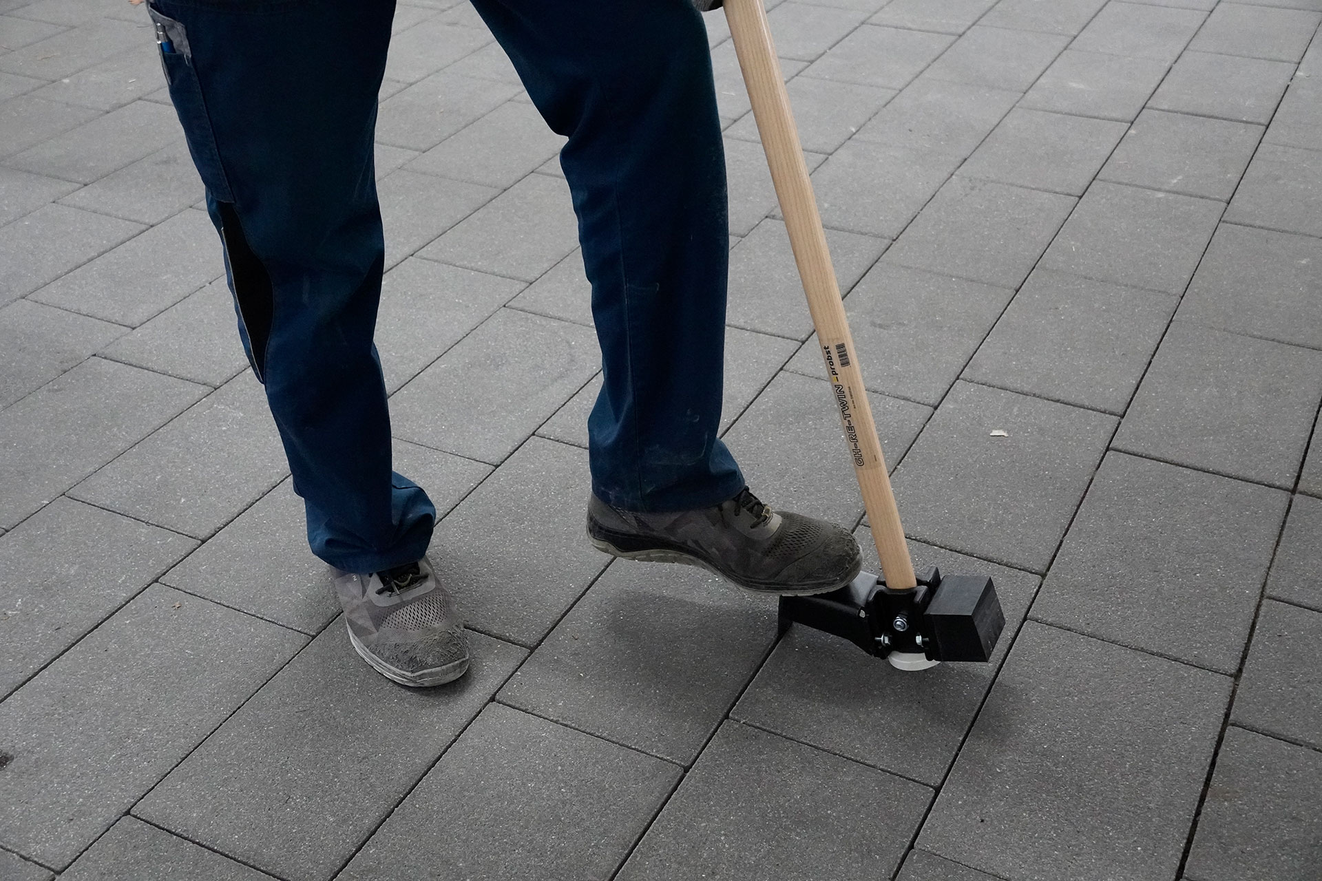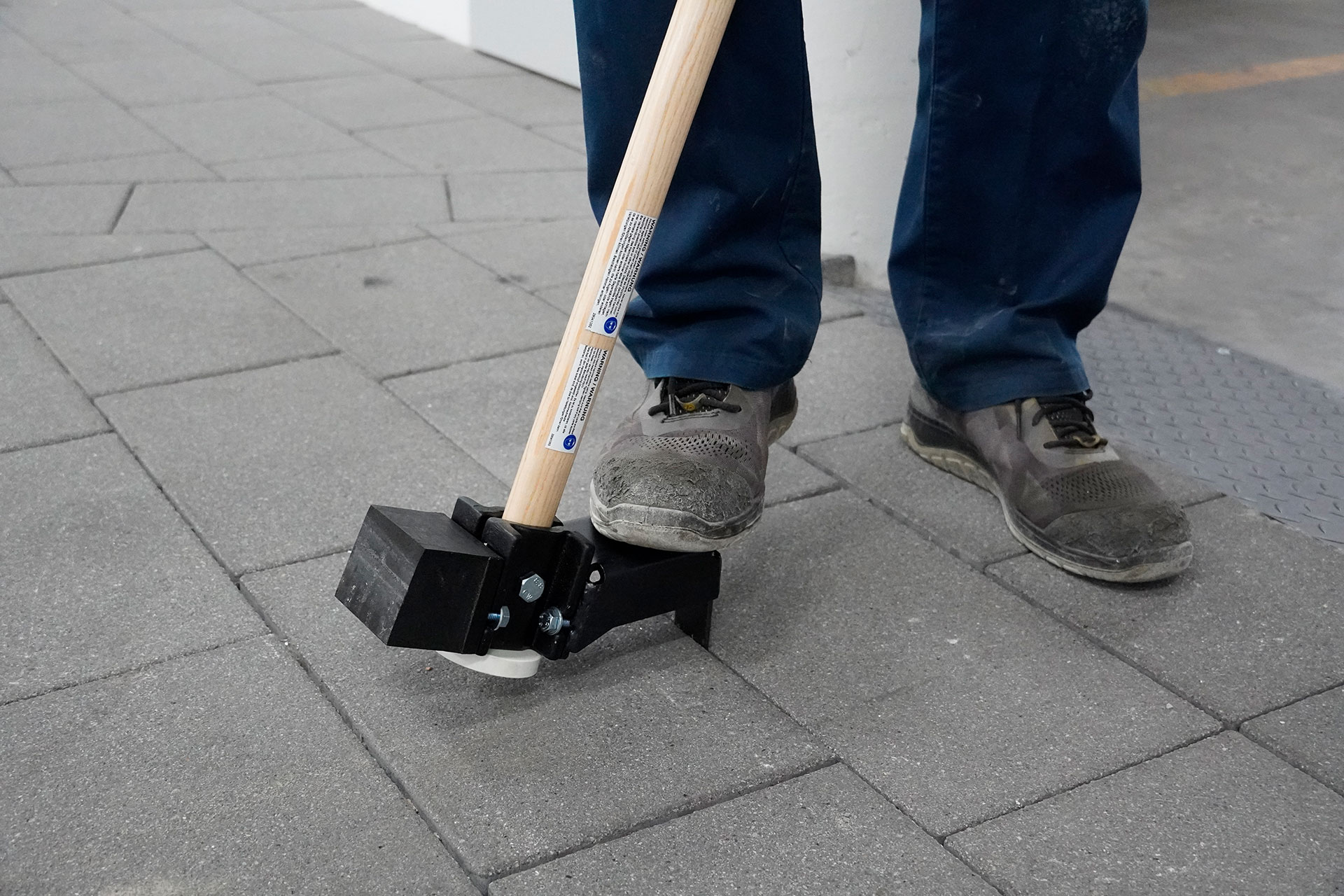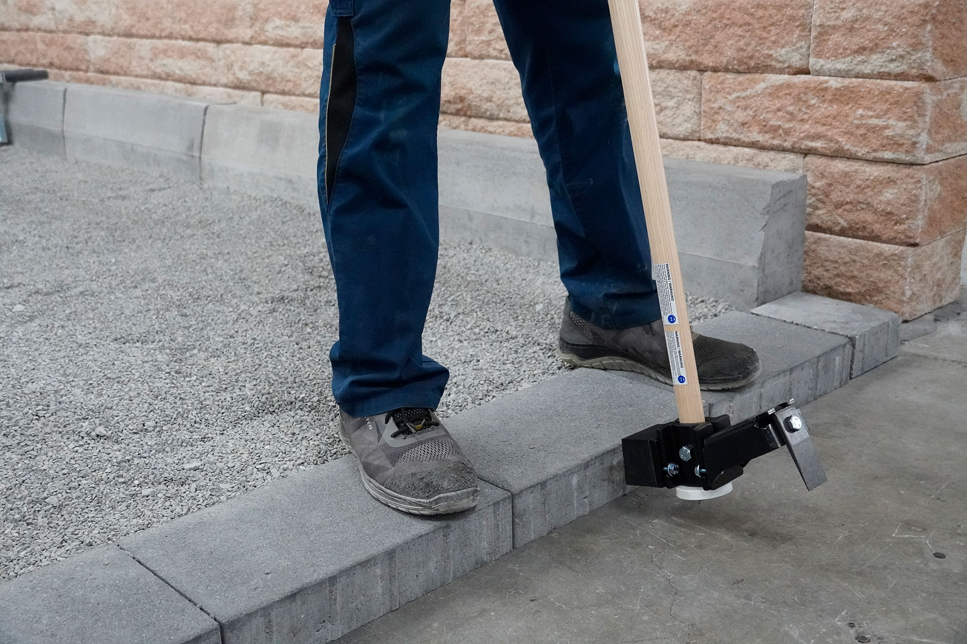 Eine Seite ist mit einem rechteckigen Gummielement mit leicht abgeschrägtem Profil bestückt, so trifft das Gummiprofil flächig auf den Stein.