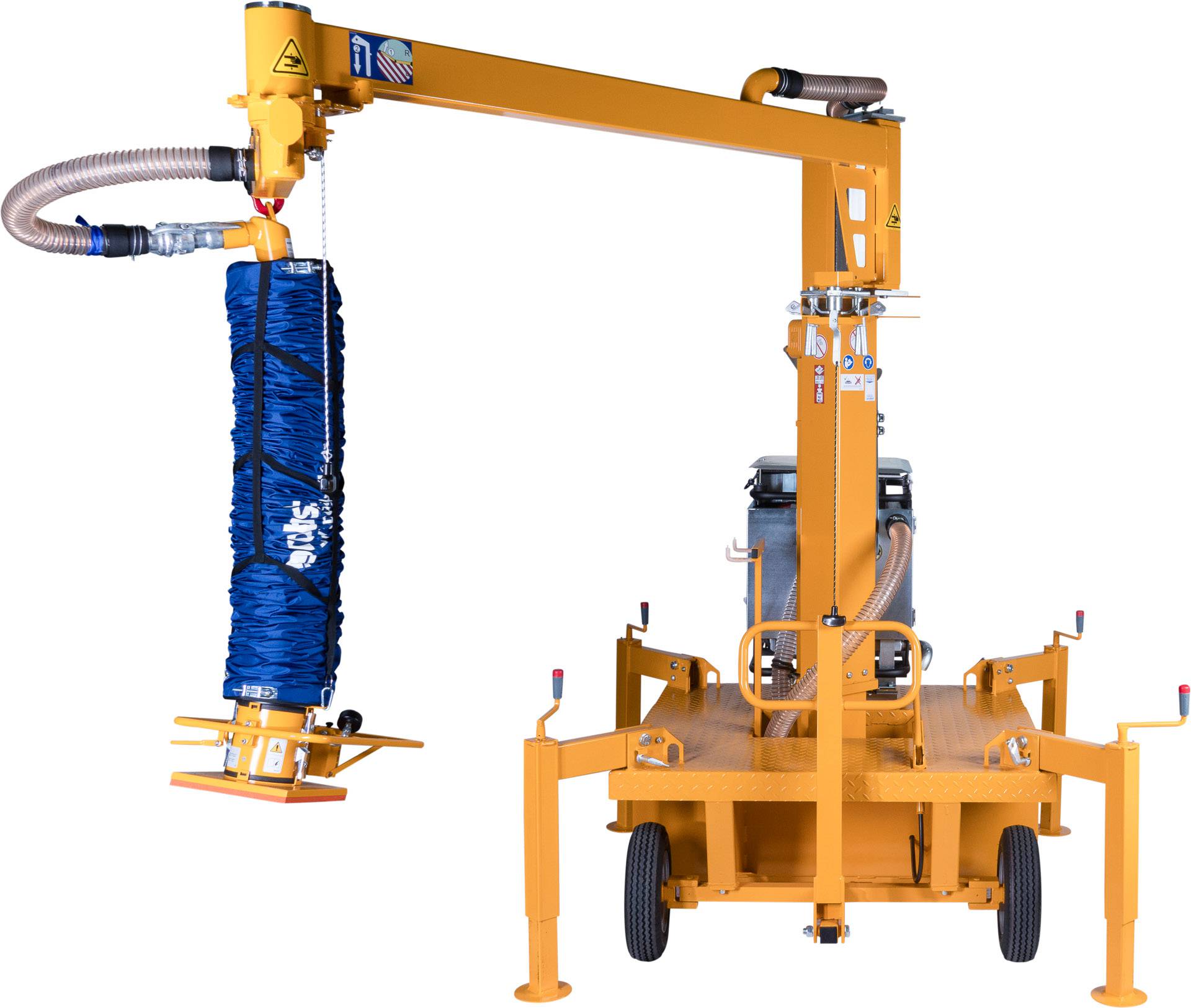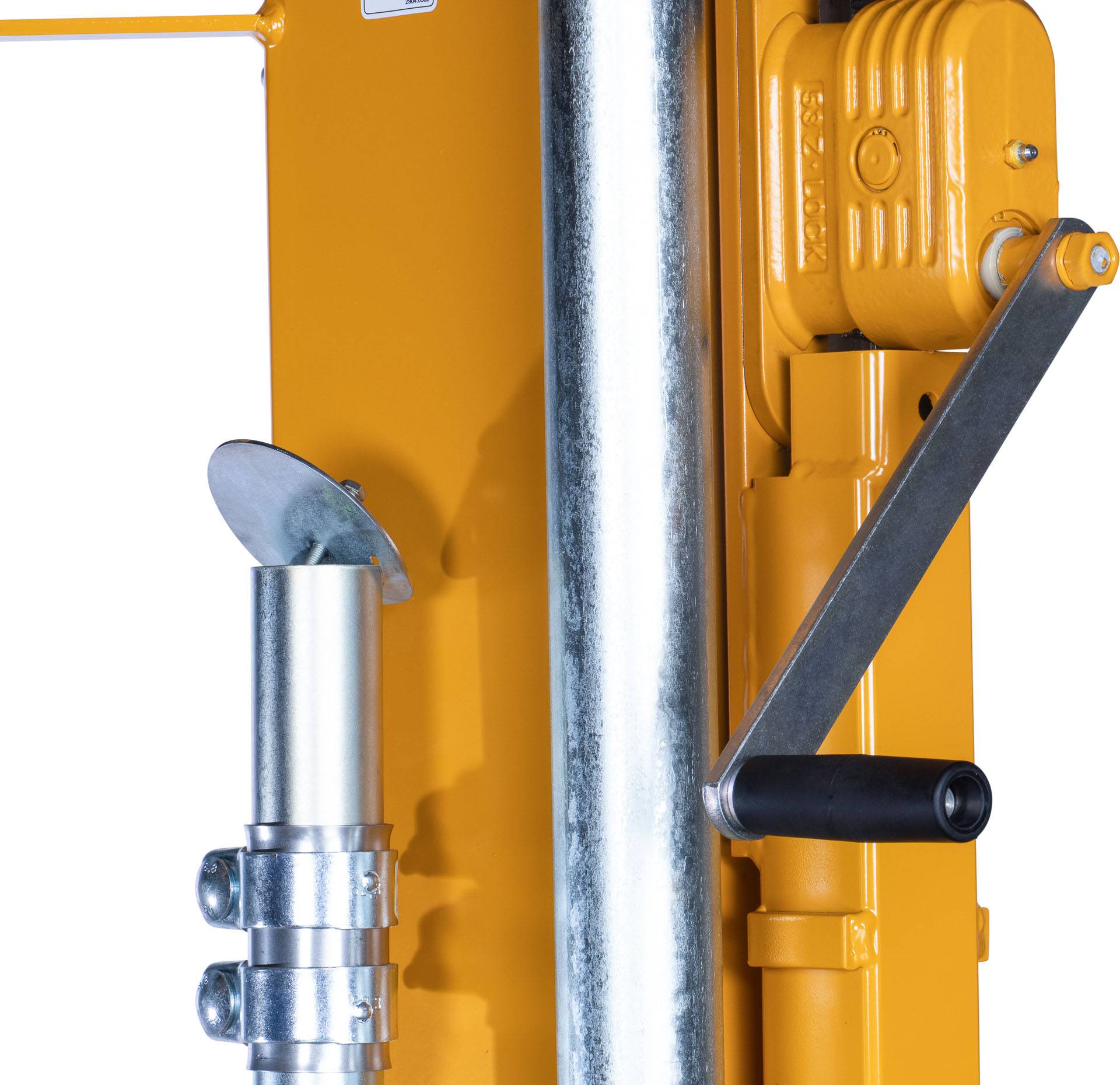In der Höhe teleskopierbar über Handspindel, Mast 3,9 m Ausladung und 350° schwenkbar mit 4 verschiedenen Arretierungsmöglichkeiten. Kompakte Transportmaße, 2 m Höhe und 2 m Länge.