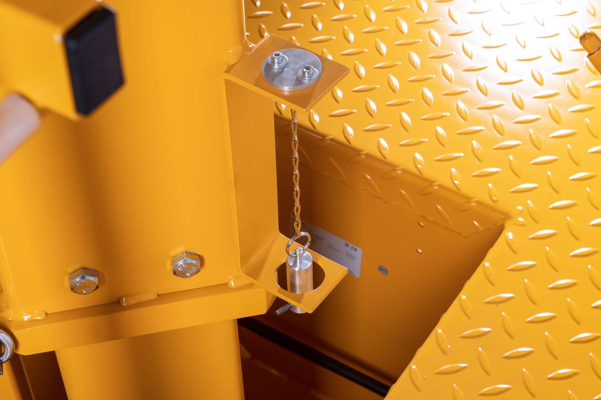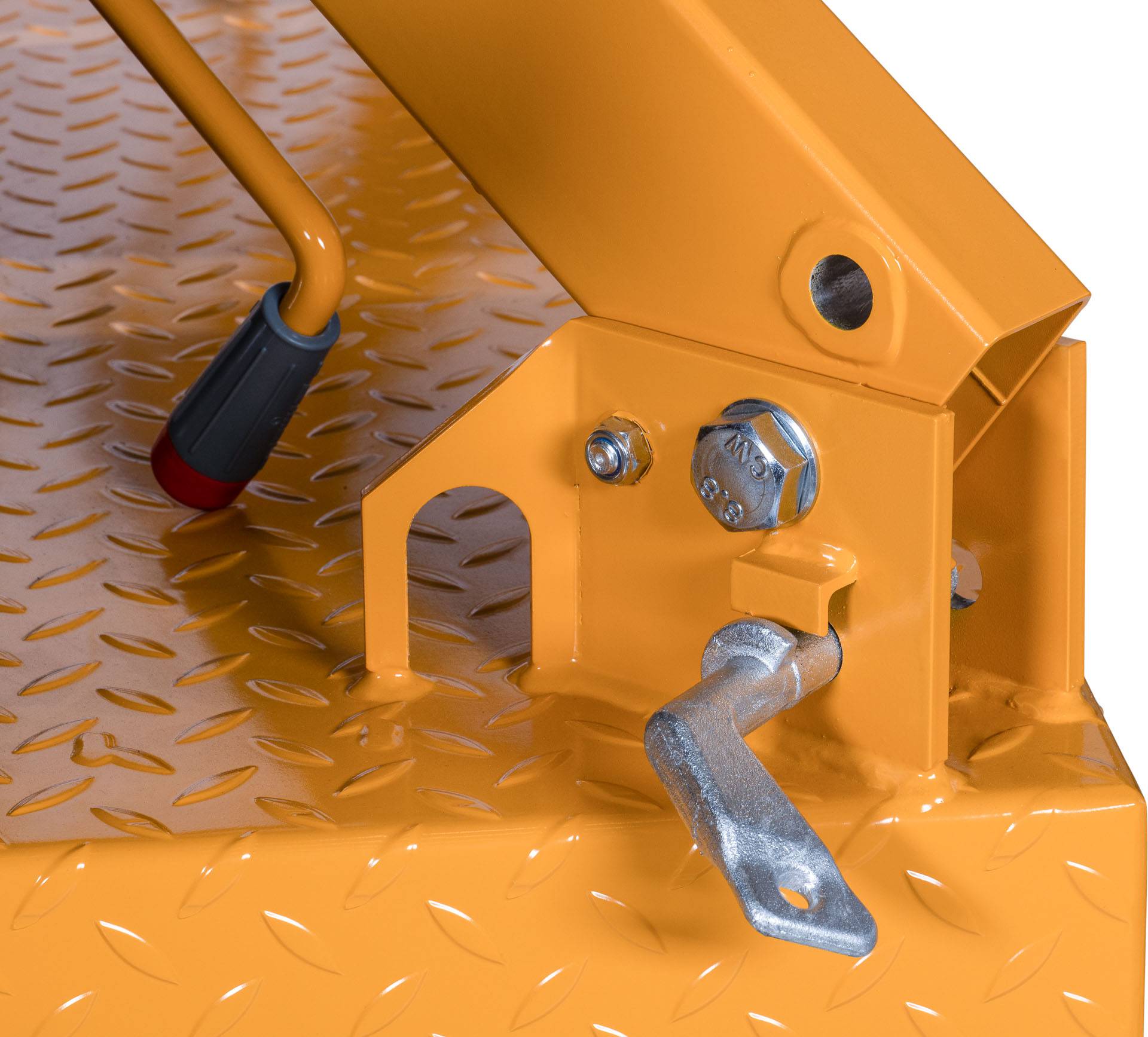 4 luftbereifte Schwerlasträder, Aufnahmestellen für Kontergewichte, ausklappbare Stützen mit Abstützspindeln.