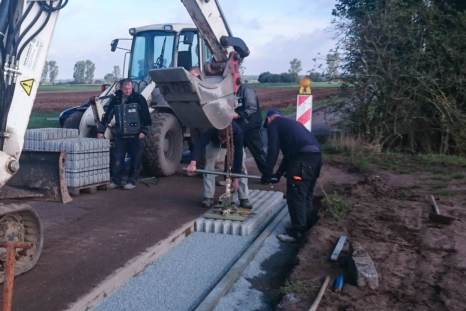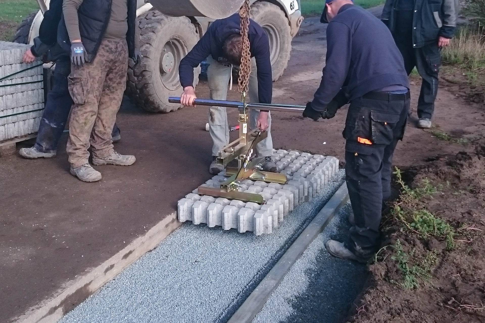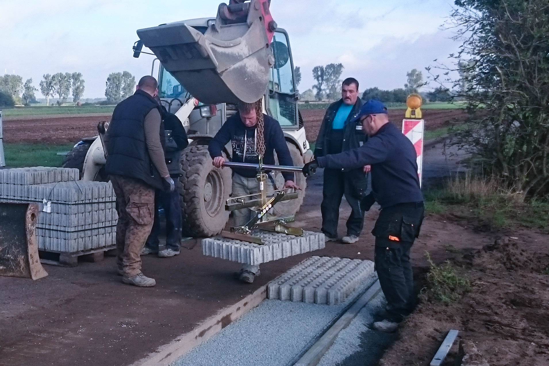 Bequem und einfach Platten verlegen auf großen Rädern. Einfacher Anbau von 2 FXAH-120 an Radsatz VPH-RS mit CB Traverse, 2 Adaptern und Bowdenzug zur Fernablöse. Verstellbare Arbeitsbreite von 200 mm bis 800 mm.