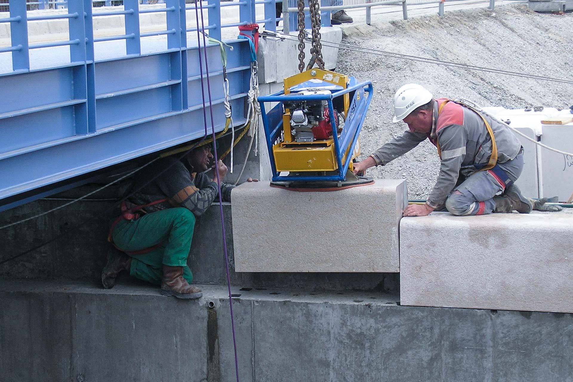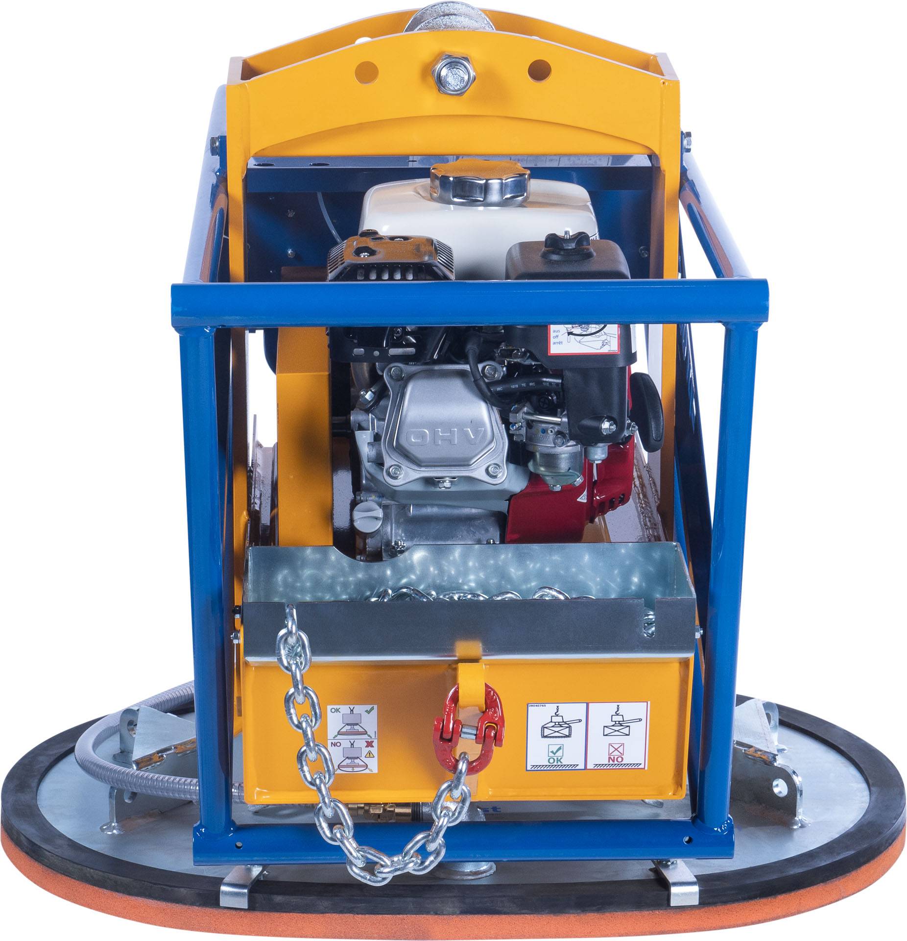 Mit langen Handgriffen zum sicheren Verlegen von großen Platten.Mit Einhängeöse und Sicherungskette zur gefahrlosen Verlegung im Hebezeugbetrieb.
