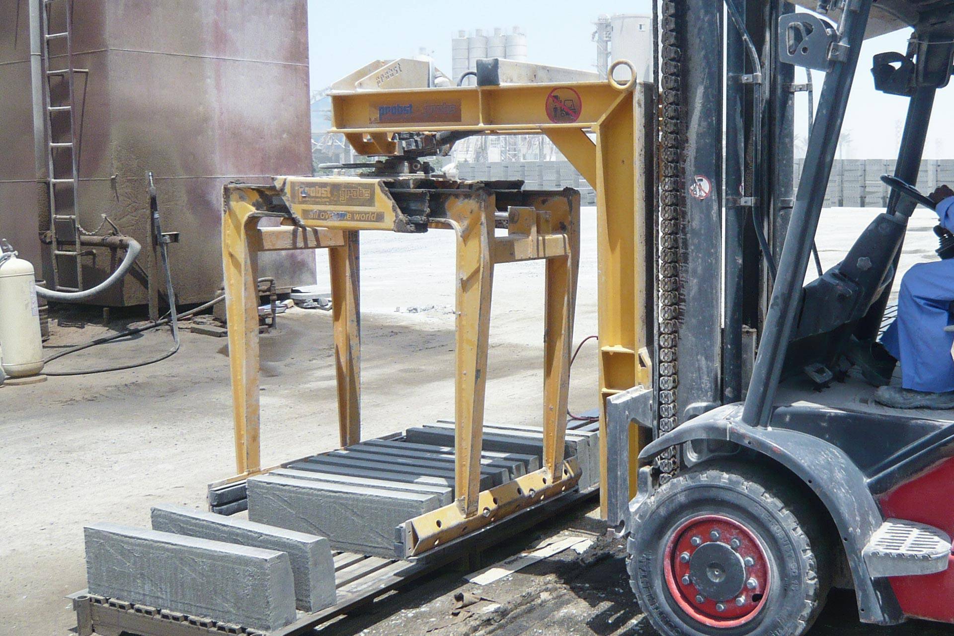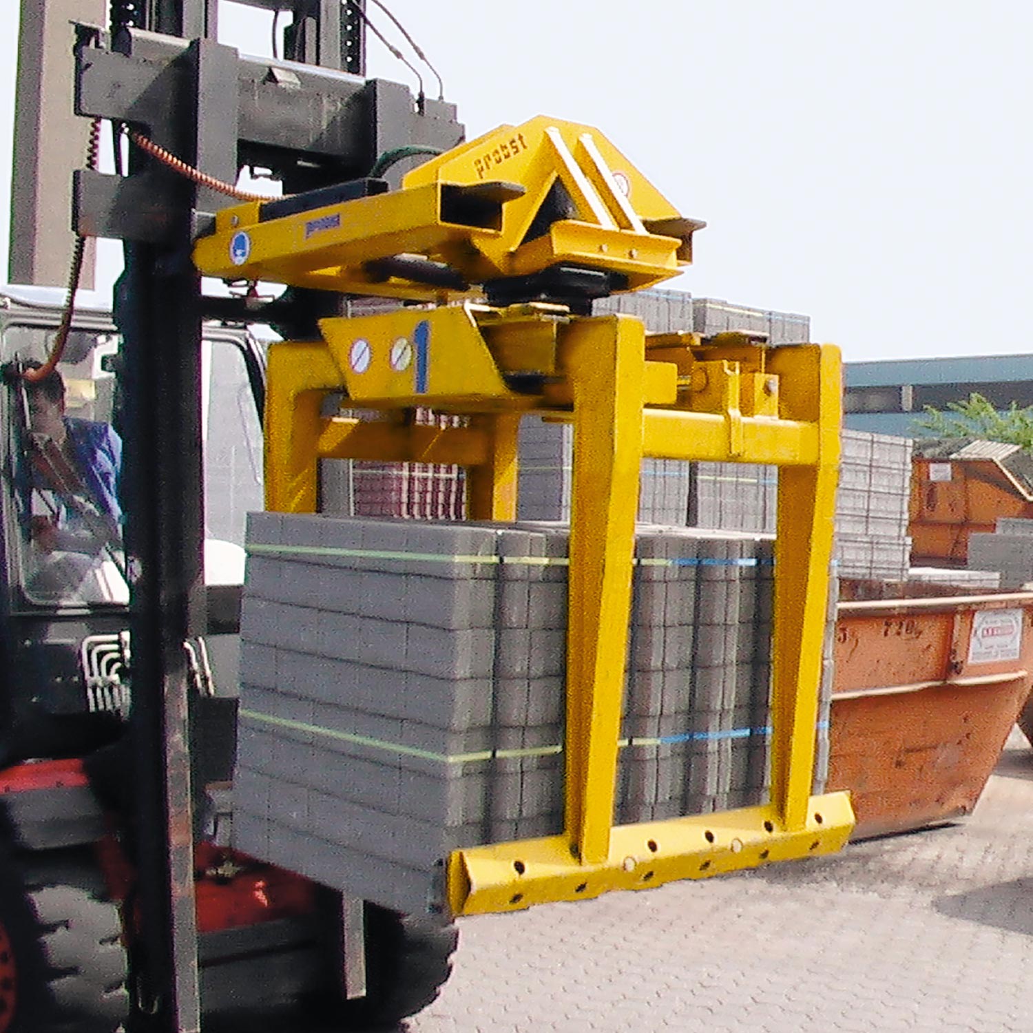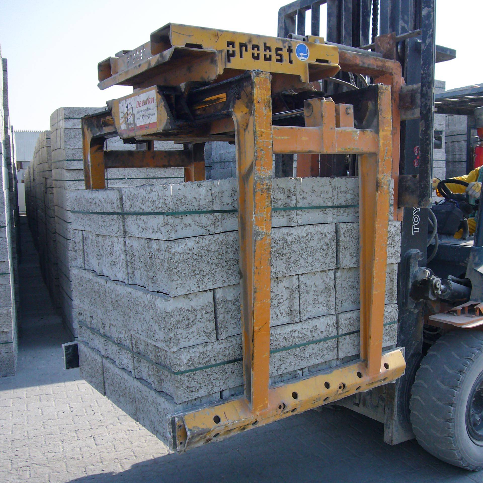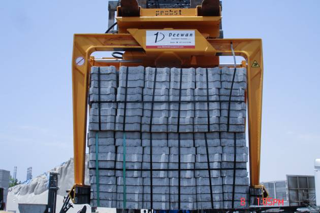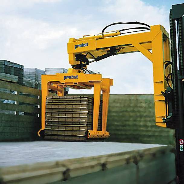 Schwerer, mehrschichtiger Einsatz am Stapler. Insbesondere in Verbindung mit Stahllamellenbacken, auch geeignet zum Greifen von nicht stahlbandumreiften Verbundsteinpaketen.
