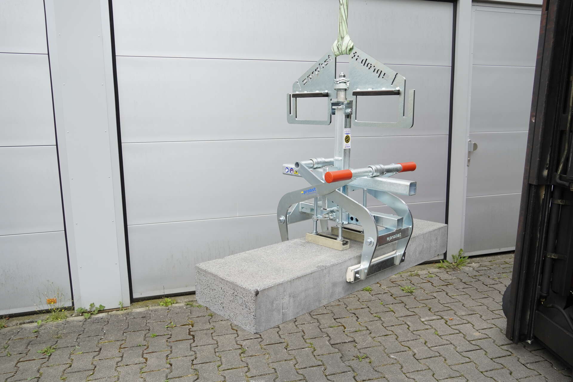 Geeignet zum Kommissionieren und Versetzen von Trittstufen, Bordsteinen, Blockstufen und Randwinkeln mit Radlader oder Gabelstapler.