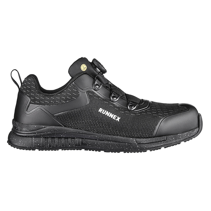 Sicherheitshalbschuh, Hydrophobierte Mikrofaser/Textilmaterial, Atmungsaktives Textilfutter, Geschlossene und gepolsterte Lasche, Ganzflächige Einlegesohle ESD PRO black, ESD-fähige Softvlies-Brandsohle, TPU/PU Sohle WELLMAXX, Kunststoffkappe, Lederfreie Ausstattung. Der innovative Sohlenkern aus INFINERGY® von BASF dämpft den Aufprall und federt bei nachlassendem Druck extrem gut in seine Ursprungsform zurück, dadurch wird Energie an den Träger zurückgegeben. Norm: EN ISO 20345 S1 SRC, Form A.
