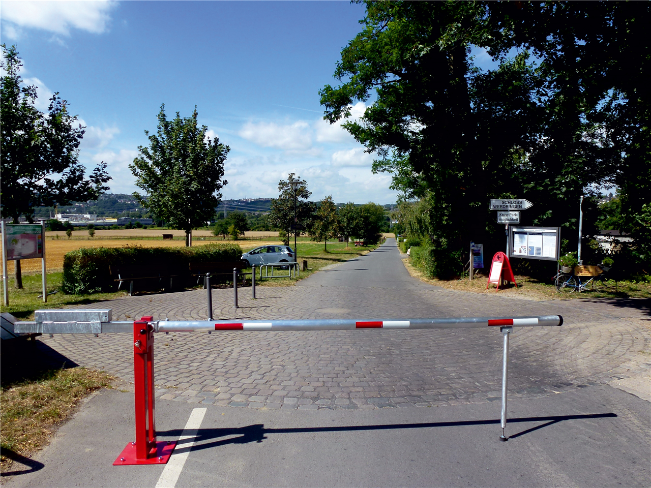 Absperrpfosten, Vierkantrohr 70 x 70 mm, mit Stahlkappe, 900 mm Überflur, herausnehmbar, mit Dreikantverschluss nach DIN 3223, oben innenliegend, selbsteinrastende Verriegelung, mit Bodenhülse Typ 470.10, ca. 500 mm Unterflur, feuerverzinkt und weiß beschichtet mit drei rot reflektierenden Leuchtstreifen, ohne Öse