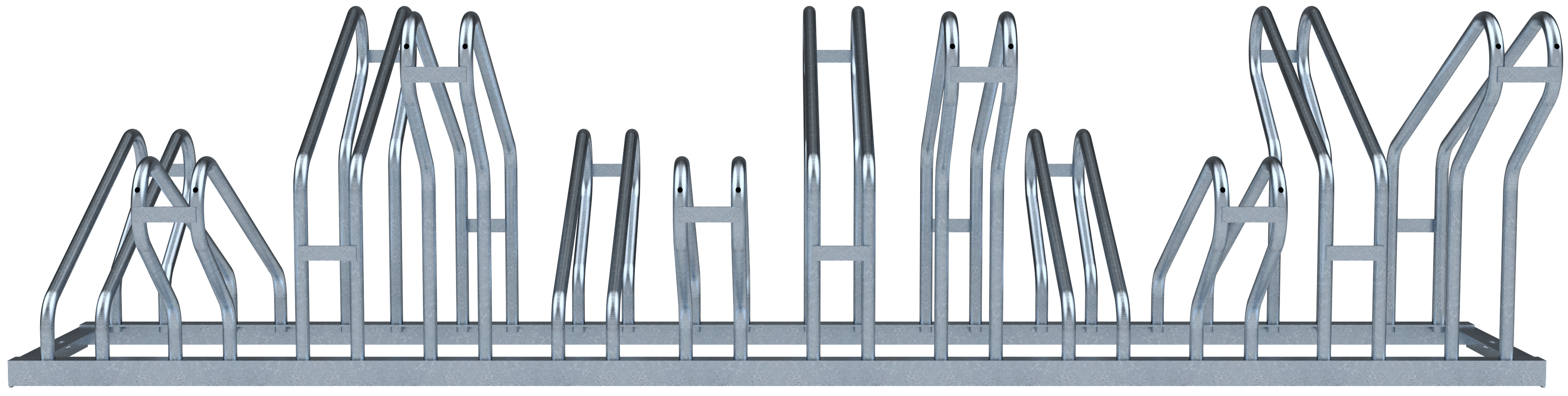 Fahrradständer, Bügel 19 mm Rundrohr, Höhe ca. 510 mm, abwechselnd Hoch- / Tiefstellung, Fahrradreifenbreite bis 55 mm, Tiefe einseitig: ca. 500 mm, Tiefe doppelseitig: ca. 600 mm, Radeinstellung doppelseitig, 2 x 6 Einstellplätze, Länge: 2100 mm