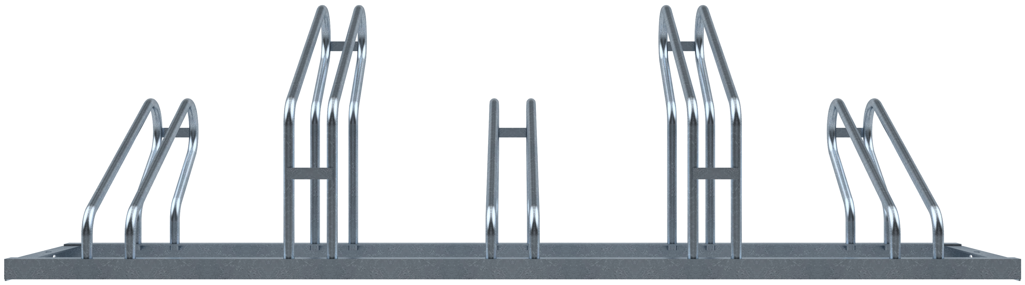 Fahrradständer, Bügel 19 mm Rundrohr, Höhe ca. 510 mm, abwechselnd Hoch- / Tiefstellung, Fahrradreifenbreite bis 55 mm, Tiefe einseitig: ca. 500 mm, Tiefe doppelseitig: ca. 600 mm, Radeinstellung einseitig, 5 Einstellplätze, Länge: 1750 mm