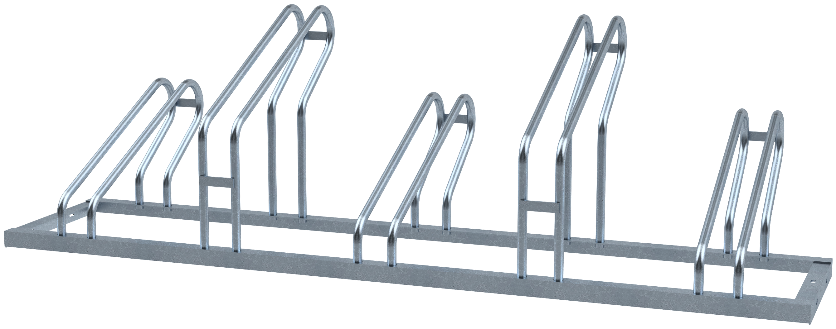 Fahrradständer, Bügel 19 mm Rundrohr, Höhe ca. 510 mm, abwechselnd Hoch- / Tiefstellung, Fahrradreifenbreite bis 55 mm, Tiefe einseitig: ca. 500 mm, Tiefe doppelseitig: ca. 600 mm, Radeinstellung doppelseitig, 2 x 3 Einstellpätze, Länge: 1050 mm