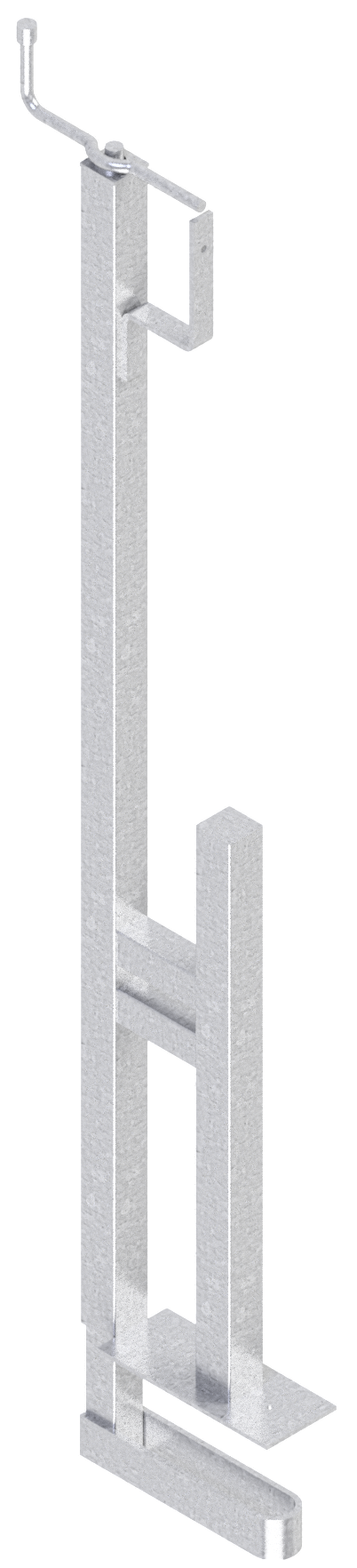 Schutzgeländerzwinge mit Kurbel für die Absturzsicherung beim erhöhten Arbeiten. Zwinge wird mittels Gewindestange und Mutter auf Decke aufgepresst und kann für Decken bis zu 40 cm Dicke verwendet werden. Die Mechanik befindet sich im Inneren der Schutzgeländerzwinge und ist somit gut geschützt und langlebig. Durch bequemes Kurbeln in handlicher Höhe kann die Schutzgeländerzwinge mühelos fixiert werden. Zur Absturzsicherung kann ein Brett in den dafür vorgesehenen Haken eingehängt werden. Zur Fixierung des Bretts befindet sich eine Bohrung in dem Haken, die sich zum Vernageln des Bretts eignet