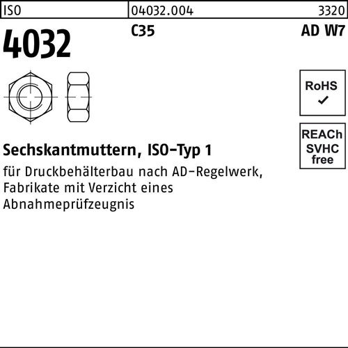 ISO 4032 C 35 AD W7 Sechskantmuttern · ISO-Typ 1 - Abmessung: M 12 VE=S (100 Stück) Weitere technische Eigenschaften: · Gruppencode: 04032.004