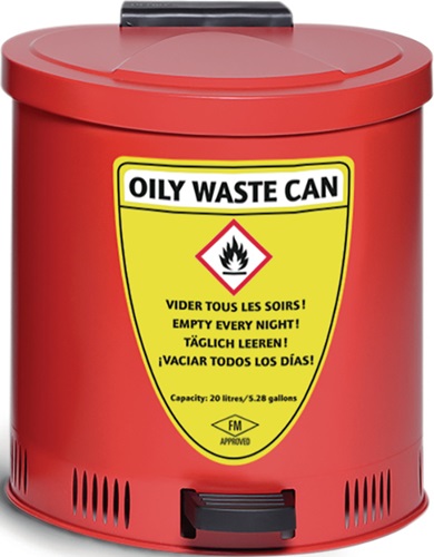 aus Stahlblech · pulverbeschichtet · reduziert den Austritt von Dämpfen auf ein Minimum · sichere Aufstellung direkt am Arbeitsplatz · Öffnen über großflächiges Fußpedal mit rutschhemmender Oberfläche · Deckel selbstschließend · Bodenrand mit Lüftungsöffnungen, Selbstentzündung des Inhaltes wird dadurch verhindert · FM-zertifiziert