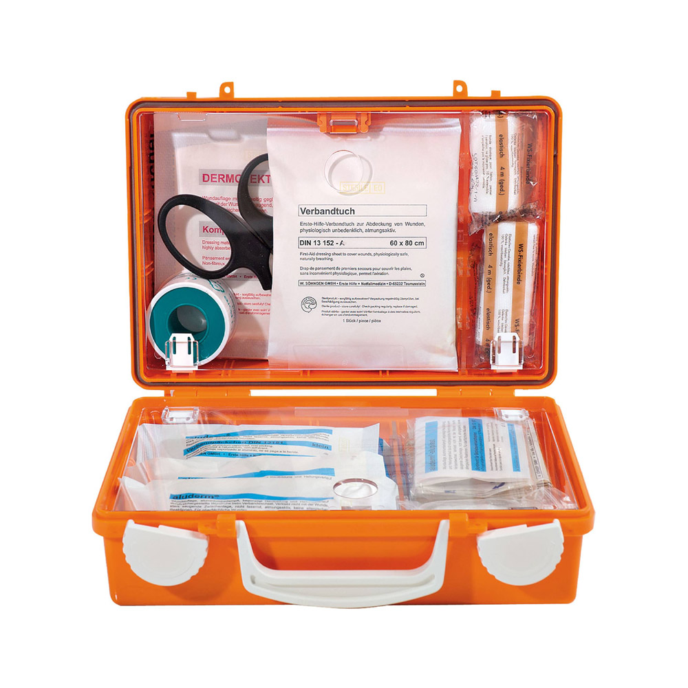 Füllung nach DIN 13157 · gut ausgestattetes Erste-Hilfe Kit aus dickem, strapazierfähigem Material · die Produkte stecken in durchsichtigen Kunststoffhüllen, um einen guten Überblick zu ermöglichen · Platz für Produkte nach eigener Wahl · mit Reißverschluss Weitere technische Eigenschaften: · prüfpflichtig: ja