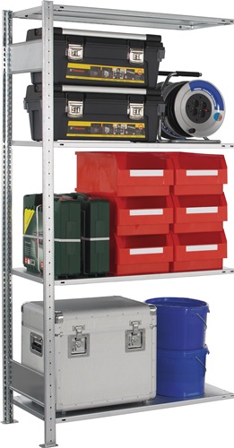 leer zur individuellen Bestückung · verzinkt · Grund- und Anbauregal in Modulbauweise · einfache und schnelle Steckmontage mit vormontierten verzinkten Rahmen · Fachböden verzinkt mit verstärktem Kastenprofil, H 25 mm, höhenverstellbar im 25-mm-Raster · Tragfähigkeit pro Fachboden 150 kg · Feldlast 1300 kg (bei gleichmäßig verteilter Last) Regalaußenmaße: Breite Grundregal + 60 mm, Anbauregal + 6 mm, Tiefe + 36 mm Weitere technische Eigenschaften: · Oberfläche: verzinkt · prüfpflichtig: ja