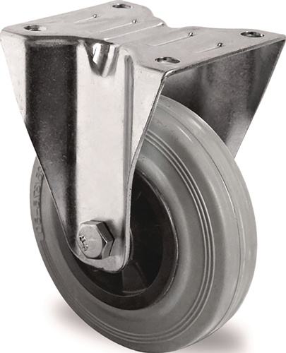 Transportgeräterolle · Radkörper: Polypropylen schwarz · Vollgummireifen grau 85° Shore A · Rollenlager · geräuscharm · mit Plattenbefestigung · für Indoor und Outdoor Weitere technische Eigenschaften: · Radkörper: Polypropylen · Plattenlänge: 105mm · Material Gehäuse: Stahlblech · Oberfläche Gehäuse: verzinkt · Schraubloch-Ø: 9mm · Schraublochentfernung: 80/77x60mm · Arbeitstemperatur: -20 - 60°C · Befestigungsart: mit Anschraubplatte · Bauhöhe: 105mm