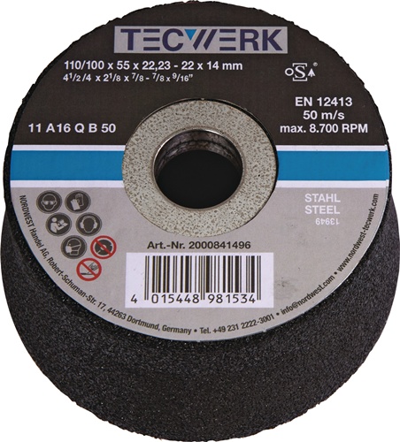 Eigenschaften "TECWERK Schleiftopf A16Q 110/100mm STA u.Stahlguss 16 Bohr.22,23mm "