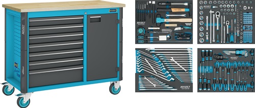 Werkbank inklusiver montierter Tür komplett mit 230-teiligem Werkzeugsortiment · Arbeitsfläche: Holz-Multiplex-Birke Arbeitsfläche, auswechselbar · flexible Schraubstockmontage (vorne, rechts, links) z.B. HAZET 2175 N nach Bohrschablonen Vorgabe · Korpus / Fahrgriff: komplette Schweißkonstruktion des ganzen Korpus für den täglichen harten Werkstatteinsatz · Farbe Korpus: HAZET-Blau · optimierter, nachgebender Kantenschutz an allen vier Ecken mit echtem Aufprallschutz durch innenliegendes Dämpfungskonzept · Kabeldurchlass an Rückwand ermöglicht z.B. Aufladen von Akkugeräten bei abgeschlossener Tür · Verriegelungs-Konzept: Mittig angeordnetes Schloss (Zentralverriegelung und Zylinderschloss) verschließt gleichzeitig Tür und Schubladen · nur noch ein Schlüssel für gleichzeitiges Verschließen von Tür und Schubladen (Lieferumfang: 2 Schlüssel) · 180° Drehung, verhindert Abbrechen des Schlüssels · 100% Auszug mittels kugelgelagerter Teleskopschienen – Selbsteinzug · gegenseitige Auszugssperre für minimales Kipprisiko · Schubladen-Konzept: Selbsteinzug und gegenseitige Verriegelung der Schubladen verhindert ungewolltes Öffnen · 100% Auszug mit kugelgelagerten Teleskopschienen · Schubladendesign zur optimalen Nutzung des Innenraums · Schubladenfronten für optimiertes Handling · schmutzunempfindliche Schubladen-Beschichtung zur einfachen Reinigung · 25 kg Traglast pro Schublade, 1 Schwerlast-Schublade, Tragkraft 40 kg, 166 mm hoch · 2 Ablageflächen im Regalteil, oben: 15 kg / unten: 35 kg · Schubladengröße für Ordnungssystem 3/3+ · Fahrwerk: Große stark belastbare Räder (Ø 125 mm) mit Präzisionskugellager und zweifachem Kugelkranz im Schwenklager, einfaches Bewegen auch bei hoher dynamischer Last · 2 Lenkrollen mit Doppelstopp: gebremste Rolle verhindert Wegrollen, gebremstes Schwenklager verhindert Drehen der Lenkrollen, z.B. auf schrägen Flächen · Schutzring verhindert Eindringen von Schmutz und Fäden · graue spurlose Elastikrollen ermöglichen ruhigen Lauf Maße Werkstattwagen (inkl. Griff und Räder) (B x T x H) 1150 x 600 x 964 mm Maße flache Schublade (B x T x H) 522 x 398 x 81 mm (6x) Maße hohe Schublade (B x T x H) 522 x 398 x 166 mm (1x)