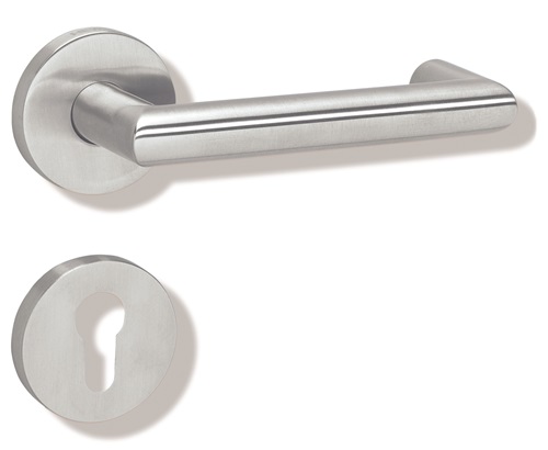 in H-Technik nach DIN 18255 und DIN EN 1906 · aus Edelstahl · Oberfläche matt geschliffen · bestehend aus: Türdrücker 165XAH, Durchmesser 21,3 mm, Rundrosetten 305.21XAH und 306.23XA · mit integriertem Hochhaltemodul mit Federunterstützung · der Drücker erfüllt die Vorgaben der DIN EN 179 · Gebrauchskategorie: Klasse 4 Garnitur mit Vierkantstift 8 - 8,5 mm · Ausführungsvorschlag! Bitte alle Maße und baulichen Gegebenheiten im Auftragsfall prüfen! Weitere technische Eigenschaften: · Nockenabstand: 38mm · Befestigungssystem: verdeckte Verschraubung